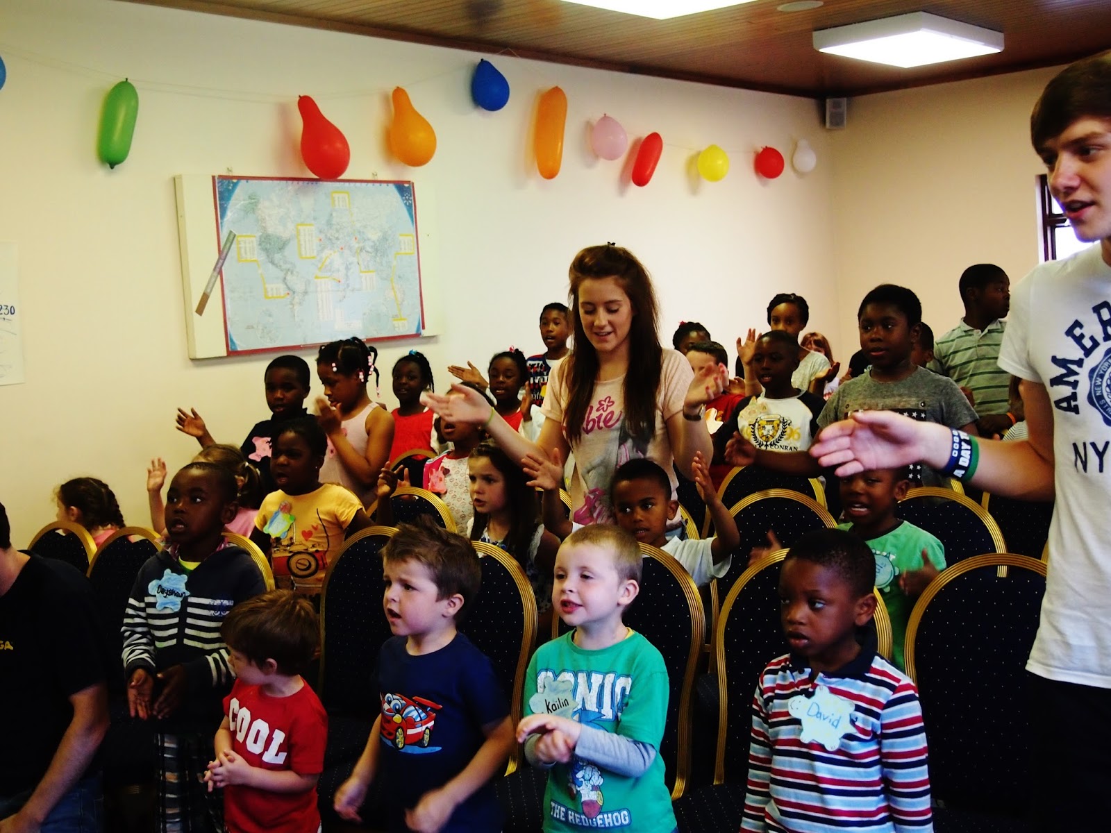 (on Monday, I did games with Tim- I'm explaining the game of fish and sharks to the kids)